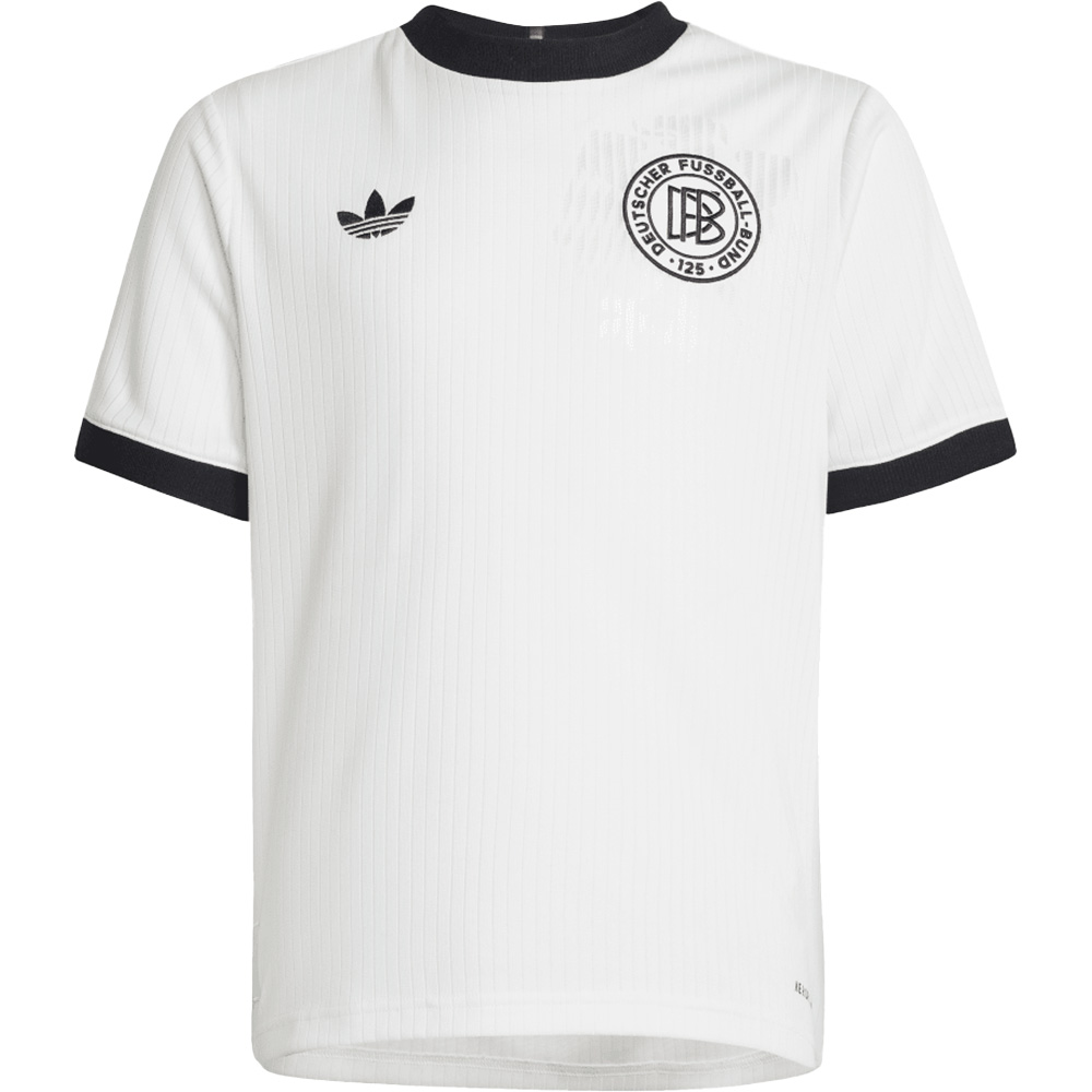 Feier mit uns das 125-jährige Jubiläum der deutschen Nationalelf und ihre lange Verbundenheit mit den 3-Streifen. Dieses Fußballtrikot für Kinder und Teens ist von legendären adidas Trikots aus früheren Zeiten inspiriert und kommt mit dezenten Nadelstreifen und einem Ton in Ton gehaltenen Adler, der in das weiche Jacquard-Material eingearbeitet ist. Außerdem garantiert die feuchtigkeitsabsorbierende AEROREADY Technologie trockenen und bequemen Tragekomfort. Das Detail über dem Saum ist außerdem eine Anspielung auf die Gedenktafel, die an die Gründung des DFB in Leipzig erinnert.