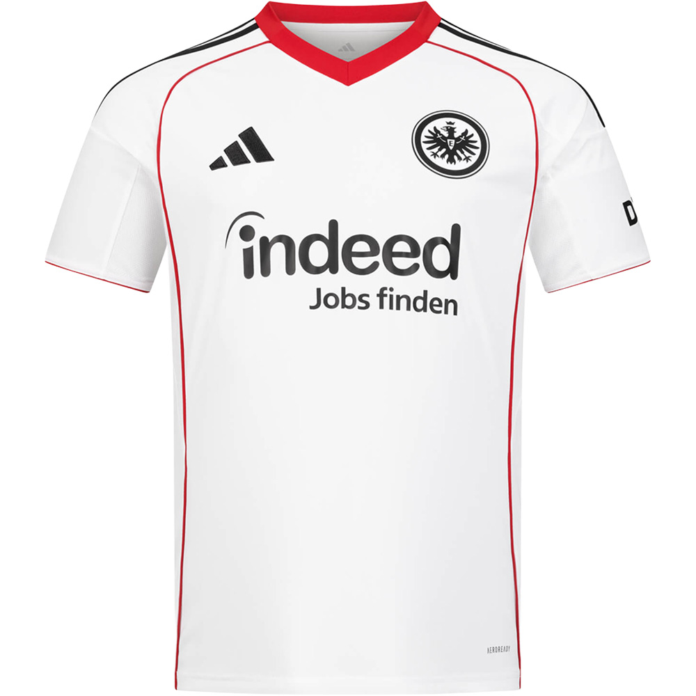 Ebenso schlicht wie elegant in strahlendem Weiß mit schwarzen und roten Elementen: Unser Auswärtstrikot für die Saison 25/26. Eine schmale rote Naht zieht sich auf der Vorderseite bis zum ebenfalls in leuchtendem Rot gehaltenen eleganten V-Ausschnitt. Schwarz auf weiß stechen die drei charakteristischen Streifen, Markenzeichen von Ausrüster adidas, auf den Schulterpartien direkt ins Auge. Ebenfalls schwarz gehalten sind auf der Brust links das Eintracht-Logo, rechts das gestickte adidas Performance Logo sowie gewohnt zentral das Logo des langjährigen Hauptsponsors Indeed.