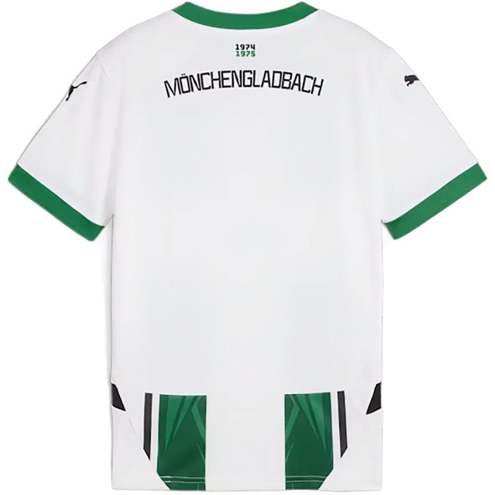 Das Design des Trikots orientiert sich an den klassischen Vereinsfarben von Borussia Mönchengladbach, in Grün und Weiß gehalten, mit markanten Details, die das Trikot modern und dynamisch wirken lassen. Auf der Vorderseite prangt stolz das Borussia Mönchengladbach-Wappen, das die Zugehörigkeit zum Verein betont. Das Puma-Logo auf der rechten Brustseite sorgt für die markentypische Optik und rundet das Design ab.