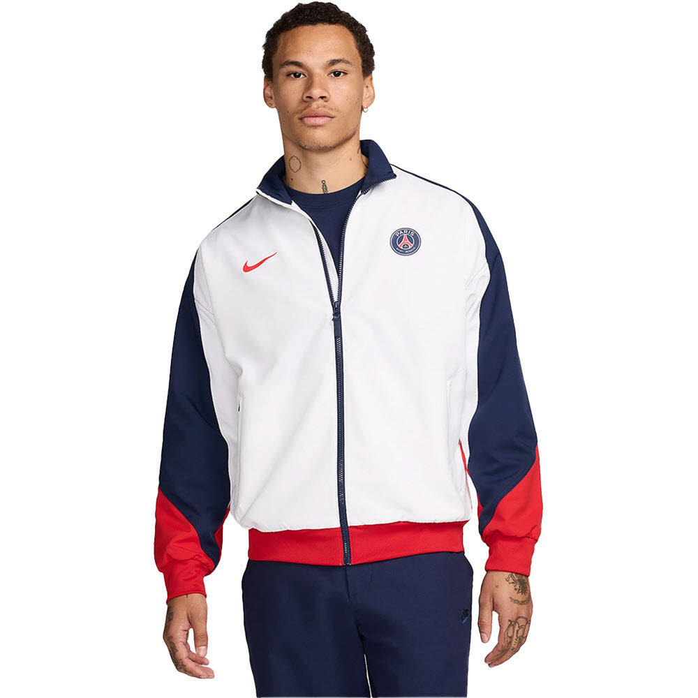Die Paris Saint-Germain Jacke mit Reißverschluss ist die perfekte Wahl für junge Fußballfans und angehende Profis, die sich auf das nächste Spiel oder Training vorbereiten möchten. Diese Jacke kombiniert sportlichen Stil mit funktionalen Details und ist ideal, um sich vor oder nach dem Spiel aufzuwärmen oder während des Trainings den eigenen Fähigkeiten den letzten Schliff zu verleihen. Dank der innovativen Nike Dri-FIT-Technologie bleibt die Jacke während intensiver Aktivitäten angenehm trocken, da sie Feuchtigkeit vom Körper ableitet und für schnellen Feuchtigkeitstransport sorgt. Dies sorgt dafür, dass du dich auch bei intensiven Trainingseinheiten oder während des Spiels auf deine Leistung konzentrieren kannst, ohne dich durch Schweiß ablenken zu lassen. Die Jacke zeichnet sich durch eine weite Passform aus, die dir uneingeschränkte Bewegungsfreiheit bietet, sowie Rippmaterial an den Bündchen und am Saum, das ein Verrutschen der Jacke verhindert und für eine passgenaue Form sorgt. Dies sorgt für optimalen Komfort, ob du in Bewegung bist oder einfach nur entspannst. Mit Seitentaschen für praktische Aufbewahrung bietet diese Jacke auch zusätzlichen Stauraum für kleine Gegenstände. Das Design in Weiß, Midnight Navy und University Red repräsentiert die Farben von Paris Saint-Germain und lässt dich in jedem Moment wie ein wahrer Fan aussehen. Die Jacke ist aus 100 % Polyester gefertigt und lässt sich bequem in der Maschine waschen, was sie besonders pflegeleicht macht. Zeige deine Leidenschaft für PSG und genieße gleichzeitig hohen Komfort und Funktionalität mit dieser stilvollen Jacke.