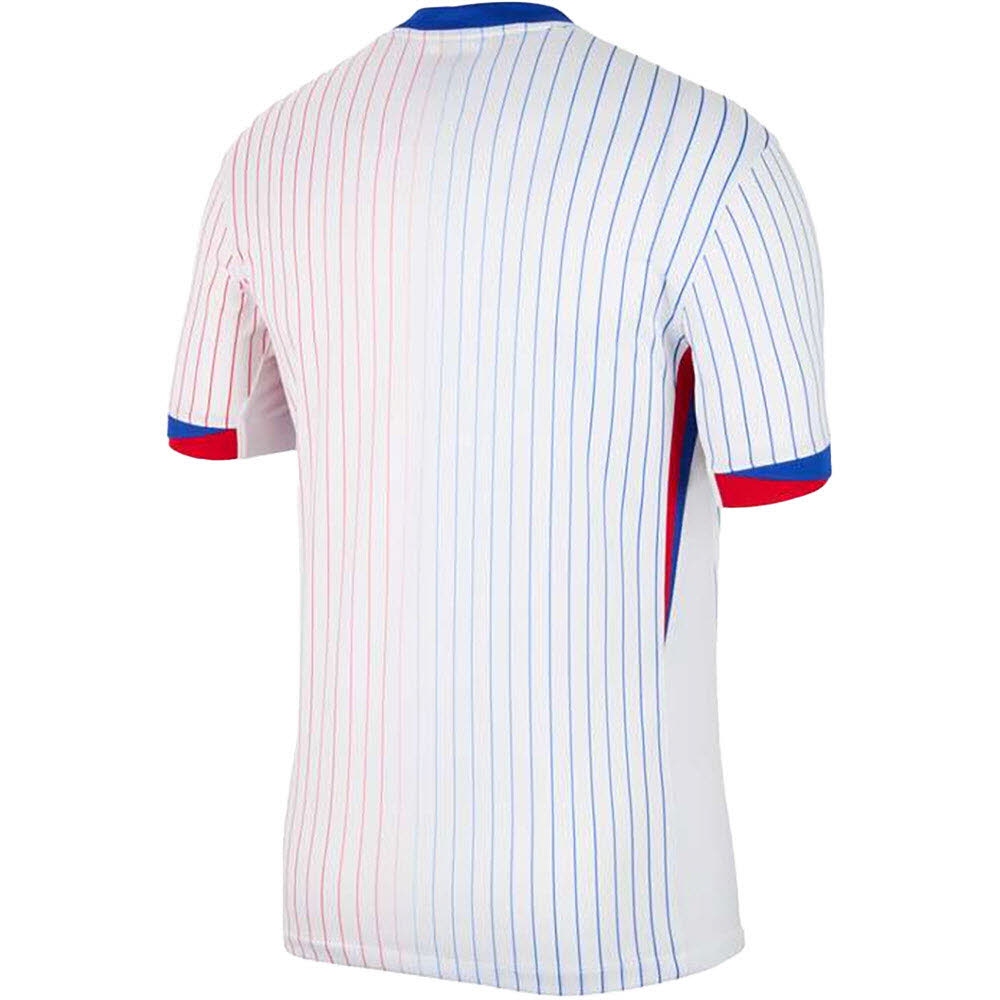 Die französische Mode und die FFF treffen in ihrem Auswärtstrikot 2024/25 aufeinander. Das Design zeigt klassische Nadelstreifen, die in Modehäusern und auch auf Frankreich-Trikots aus den 1980er und 2000er Jahren zu finden sind. Das überdimensionale Cockerel-Wappen setzt die Zelebrierung der Vintage-Trikots fort.