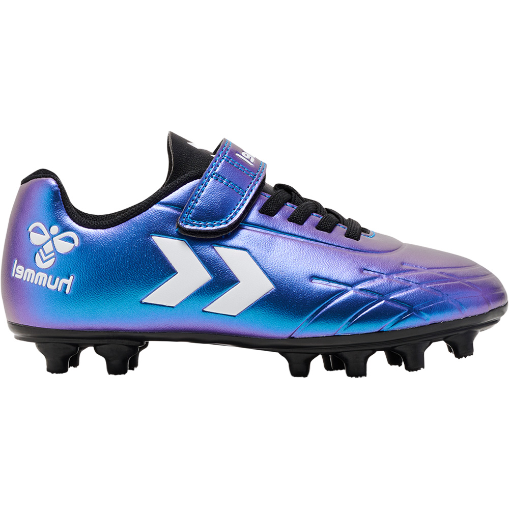 Fußballschuh für feste Böden. Ein weiches PU-Obermaterial mit elastischen Schnürsenkeln und Klettverschluss, weichem Mesh-Futter und gestanzter Innensohle. Prägungs- und Druckdetails auf dem Obermaterial. Inspiriert von der stolzen Geschichte der Fußballschuhe von hummel.