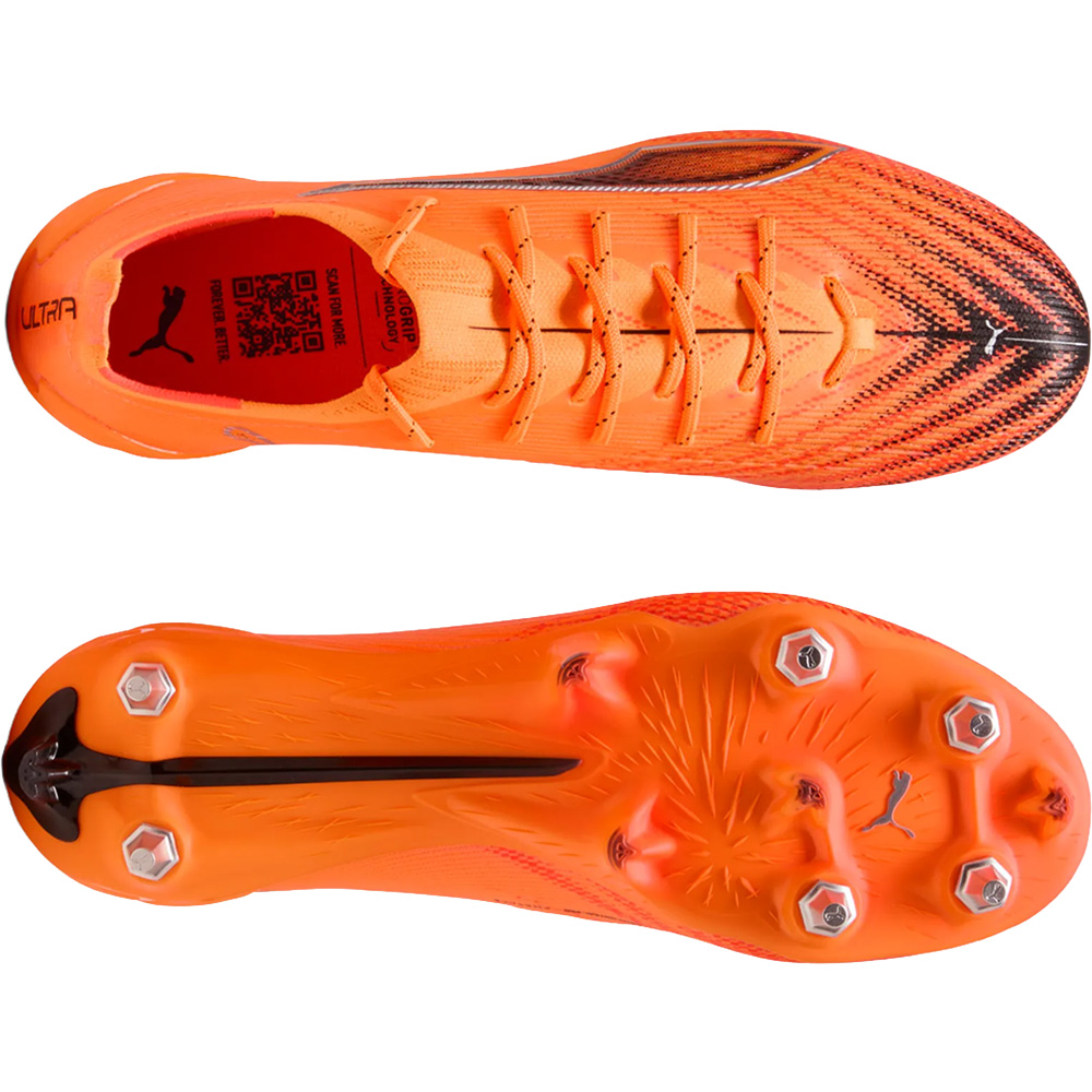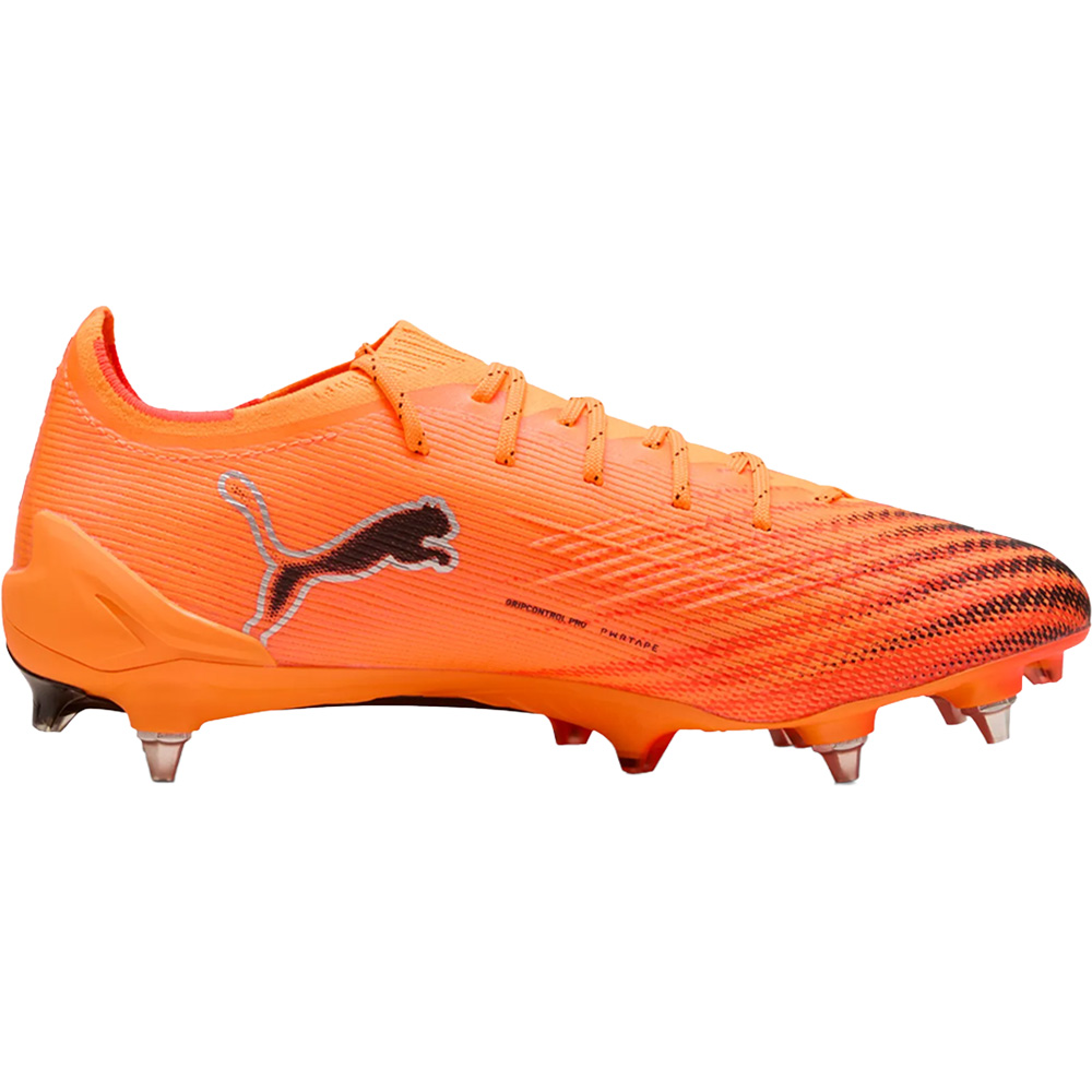 Der PUMA ULTRA 6 ULTIMATE MxSG ist ein Hochleistungs-Fußballschuh für Spieler, die auf weichen und nassen Plätzen maximale Geschwindigkeit und Stabilität verlangen. Sein ultraleichtes ULTRAWEAVE-Obermaterial mit 4-Wege-Stretch reduziert Gewicht und Reibung, während der PWRTAPE-Stützrahmen gezielt die wichtigsten Belastungszonen unterstützt, um sicheren Halt bei explosiven Bewegungen zu gewährleisten. Die speziell entwickelte SPEEDSYSTEM-Außensohle mit FastTrax-Stollenanordnung kombiniert konische und austauschbare Metallstollen und bietet so optimalen Grip auf Mixed- und Soft-Ground-Untergründen – perfekt für präzise Richtungswechsel und blitzschnelle Sprints, selbst bei schwierigen Platzbedingungen. Für zusätzlichen Komfort sorgt eine herausnehmbare Innensohle mit NanoGrip-Technologie, die ein Verrutschen des Fußes verhindert, sowie eine ORTHOLITE®-Fersendämpfung, die Aufprallkräfte effektiv abfedert. Ergänzt wird das Ganze durch eine GripControl Pro-Beschichtung im Obermaterial, die Ballkontrolle und Präzision verbessert. Mit dem ULTRA 6 ULTIMATE MxSG liefert PUMA einen leichten, reaktionsstarken und technisch ausgereiften Schuh für alle, die auf weichen Böden mit Tempo und Kontrolle dominieren wollen.