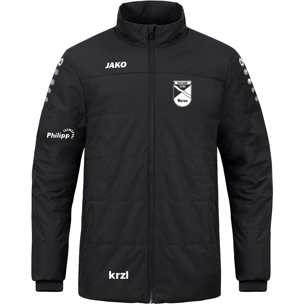 Wasserabweisendes Obermaterial (100 % Polyester) und wärmeisolierende Wattierung machen die JAKO Coachjacke Team bei kühlem Wetter zu deiner optimalen Ausstattung, wenn Du neben dem Spielfeld stehst. Integrierte Ripp-Bündchen in den Ärmeln und weiches Fleece auf der Innenseite sorgen für ein angenehmes Tragegefühl.