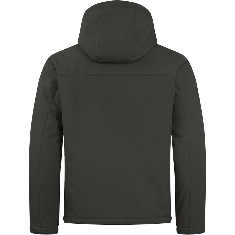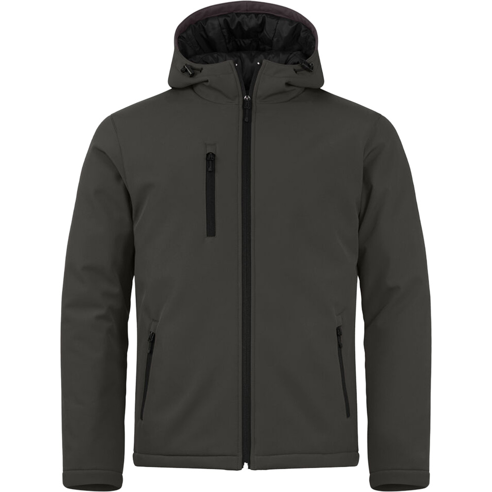 Eine clean geschnittene, wattierte Softshelljacke mit Kapuze. Drei Außentaschen mit SBS-Reißverschlüssen und einer Innentasche. Inklusive schwarzem Innenfutter und Stick-Reißverschluss. Laminiert mit Polyester-Fleece. WP 5000.