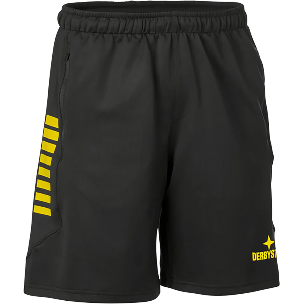 Der elastische Bund mit Kordelzug bietet eine individuelle, bequeme Passform, während der klassische Regular-Fit Bewegungsfreiheit garantiert. Praktische Seitentaschen ermöglichen das sichere Verstauen kleiner Gegenstände, und das dezente Derbystar-Logo verleiht der Shorts einen sportlich-modernen Look