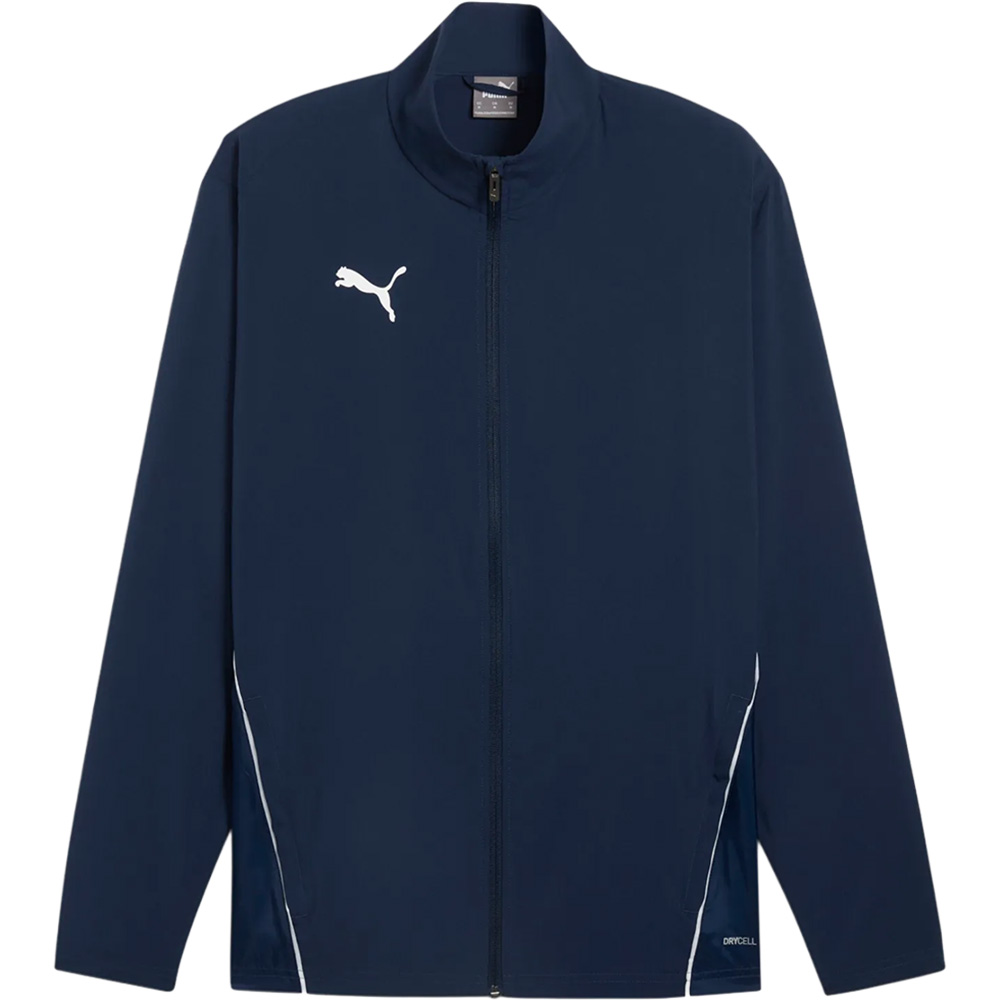 Die Jacke verfügt über einen durchgehenden Reißverschluss, einen Stehkragen und elastische Bündchen, die Wärme speichern und Komfort garantieren. Dezentes PUMA Branding und moderne Team-Design-Details runden das sportliche Erscheinungsbild ab und machen die Jacke perfekt für den Einsatz am Spielfeldrand oder in der Freizeit.