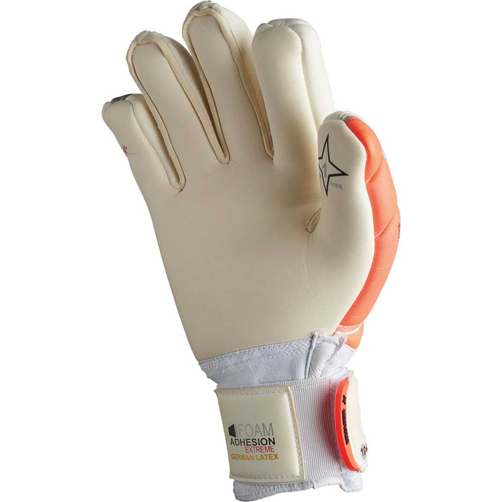 Sehr guter Torwarthandschuh. Schnitt: Innennaht. Haftschaum: 3mm DURA GRIP, weiß. Handrücken: Kombination aus Latex und Soft-EVA. Dämpfung: Gute Aufpralldämpfung. Passform: Ergonomic Fit System. Verschluss: Seitenschlitz mit Klettverschluss. Namensfeld für Personalisierung.