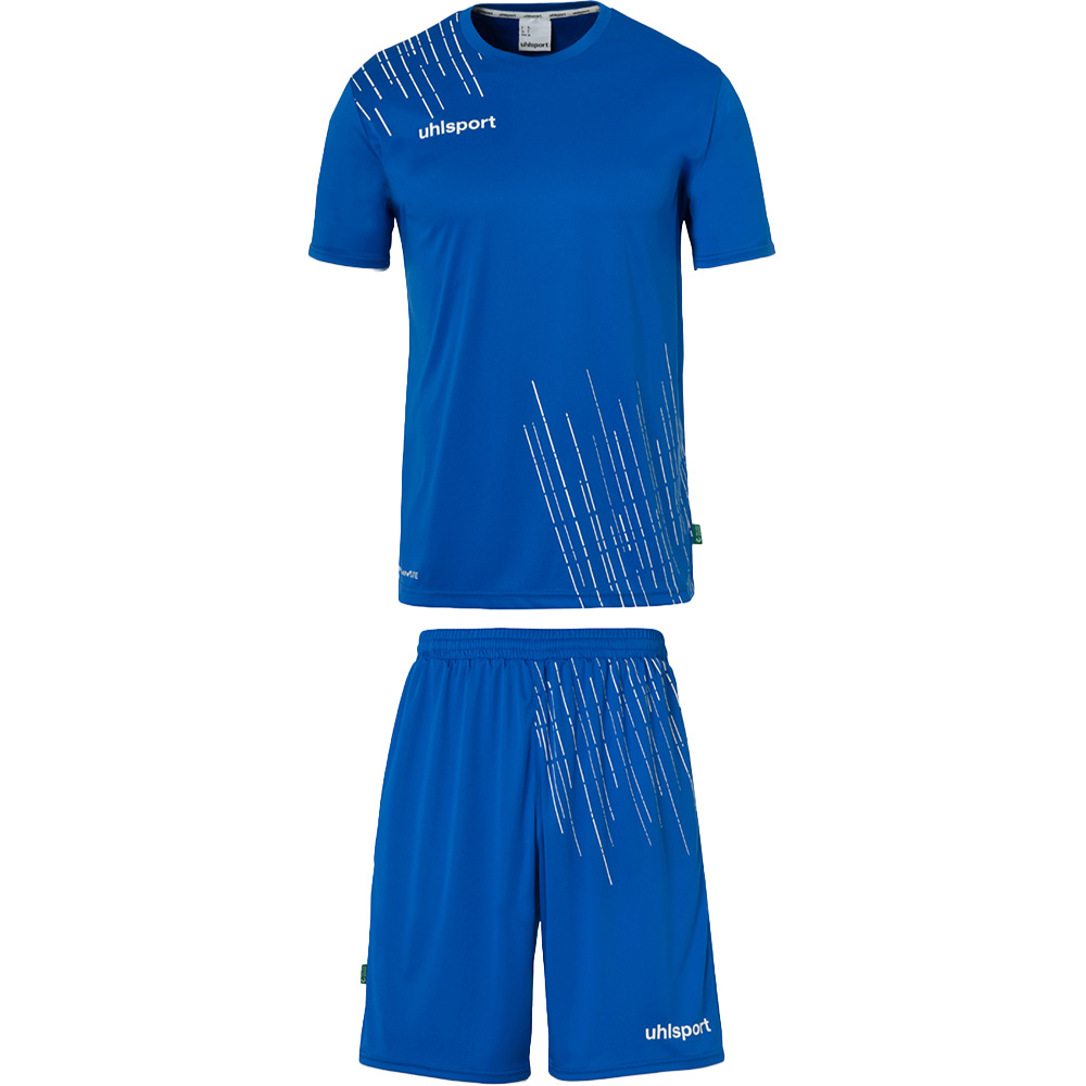Dieses Set, bestehend aus Trikot und Shorts, überzeugt mit einem modernen Design und funktionalen Details. Das Trikot verfügt über einen Rundhalsausschnitt, einen uhlsport-Druck auf der Vorderseite sowie Logodrucke auf beiden Ärmeln. Ein markantes SCORE-Druckdesign an der Taille und ein Einsatz auf der Rückseite sorgen für optische Akzente. Die Rückseite besteht aus einem speziellen Mesh-Material für optimale Belüftung. Die Shorts sind ohne Innenslip gearbeitet, mit uhlsport-Druck und einem verstellbaren, elastischen Taillenbund mit Kordel ausgestattet. Das gesamte Set wird aus recyceltem Polyester gefertigt und trägt das Label „FOR THE PLANET“.